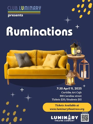 In April 2025, Luminary Theatre Company partnered with Curitiba Art Café to present Ruminations, an immersive evening of music, poetry, and theatrical storytelling. Performed to a sold-out audience, the event blended multidisciplinary performance with an intimate, site-responsive staging, expanding Luminary’s commitment to innovative formats and community collaboration.